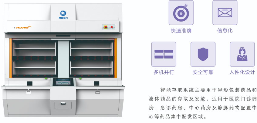 The intelligent access system is mainly used for the access and distribution of special-shaped packaged drugs and liquid drugs, and is applicable to the centralized distribution areas of drugs such as hospital outpatient pharmacy, emergency pharmacy, central pharmacy and intravenous drug distribution center.