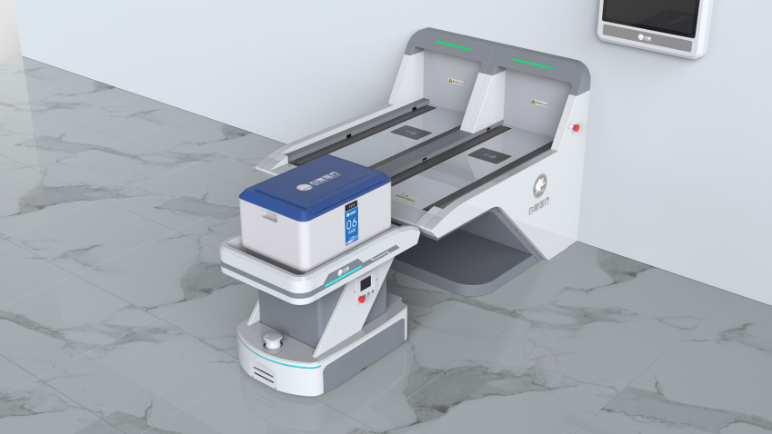The "box logistics transmission system" connects all departments of the hospital by building a receiving and sending workstation, a lifting system, an automatic transmission line, etc. to form an independent medical material transportation channel, and uses the turnover box as the carrier to realize the automatic transmission of hospital materials.